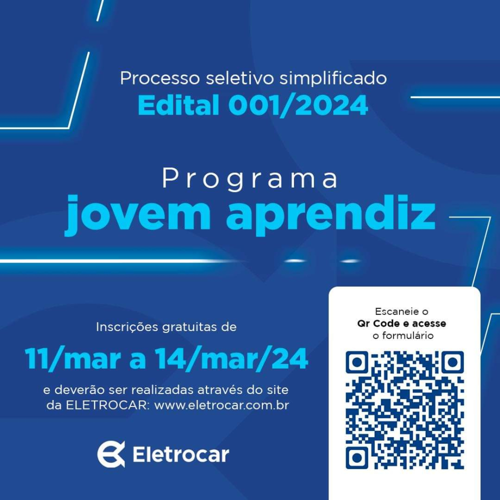 A Centrais Elétricas de Carazinho S.A. – ELETROCAR, torna público a realização de Processo Seletivo Simplificado destinado ao preenchimento de vagas para a contratação de aprendizes, bem como composição de cadastro reserva.